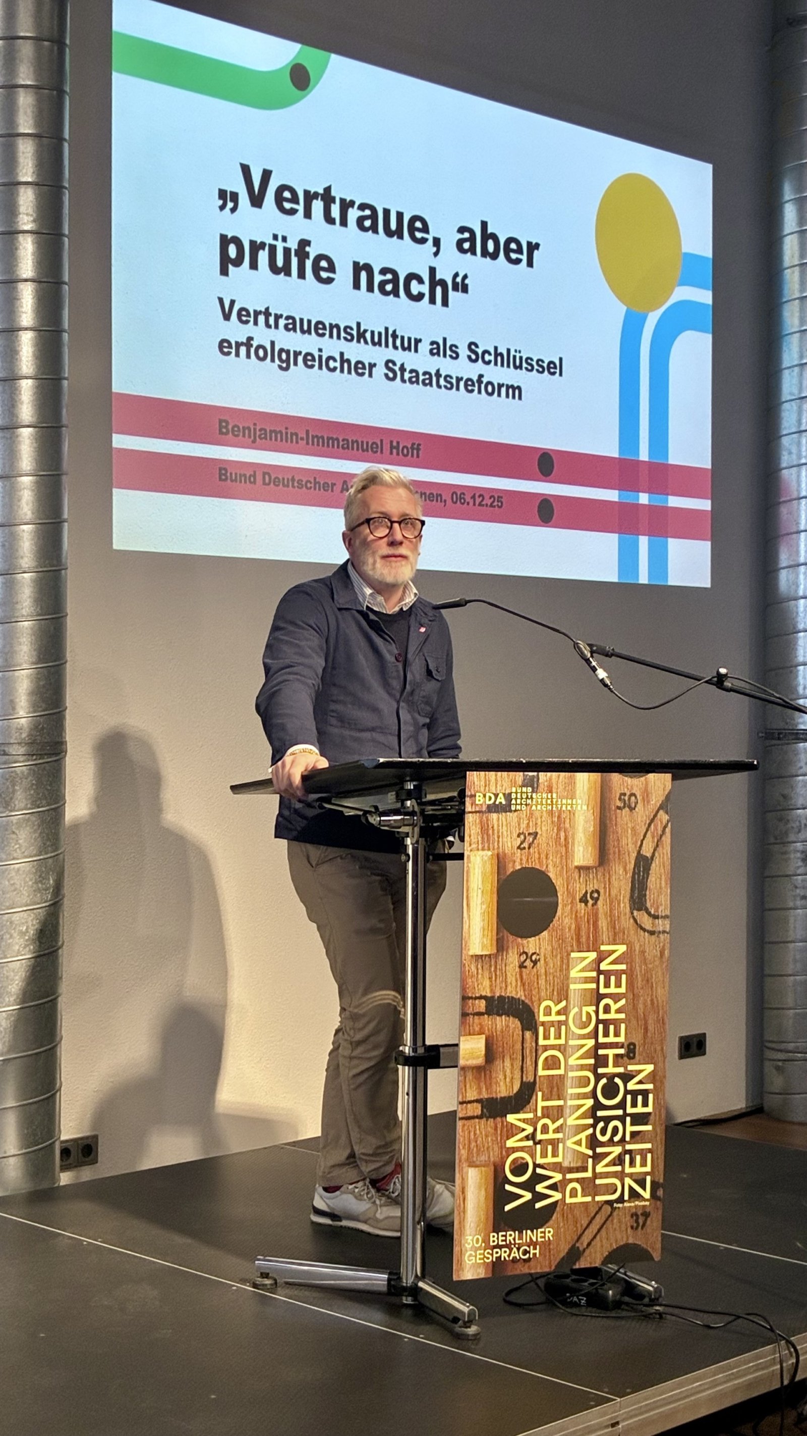 Ich war eingeladen meine Erfahrungen einzubringen und wählte als Überschrift meines Vortrags: „Vertraue, aber prüfe nach“ – Vertrauenskultur als Schlüssel erfolgreicher Staatsreform"